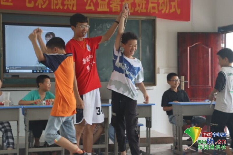 图为比赛获胜的孩子被裁判举起手臂,欢呼雀跃。中国青年网通讯员 段新利 摄