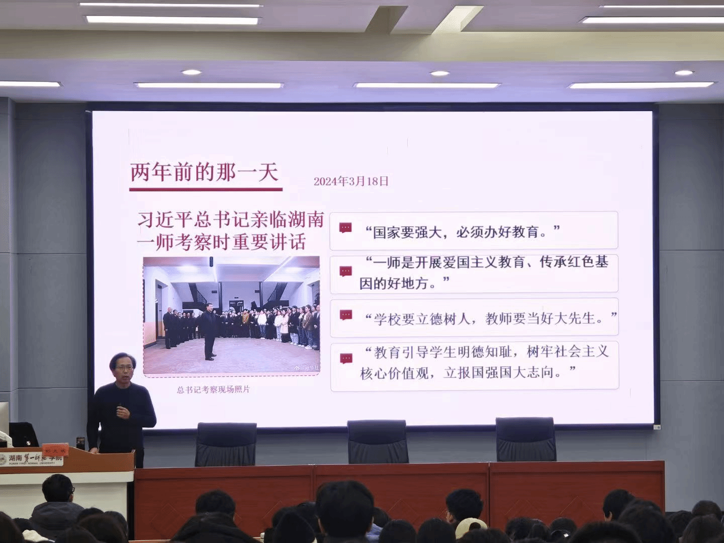 活动在观看习近平总书记考察我校新闻报道视频中拉开序幕,师生们重温了习近平总书记考察我校重要讲话精神。刘大维在专题分享中提出三点要求:一要立足“办好第一师范”战略定位,将个人理想融入国家发展大局,夯实专业根基;二要深刻理解“大思政课”内涵,做到明大德、守公德、严私德,始终保持正确政治方向;三要深入挖掘红色文化资源,传承红色基因,筑牢思想根基。他强调要将习近平总书记考察我校重要讲话精神贯穿立德树人全过程。